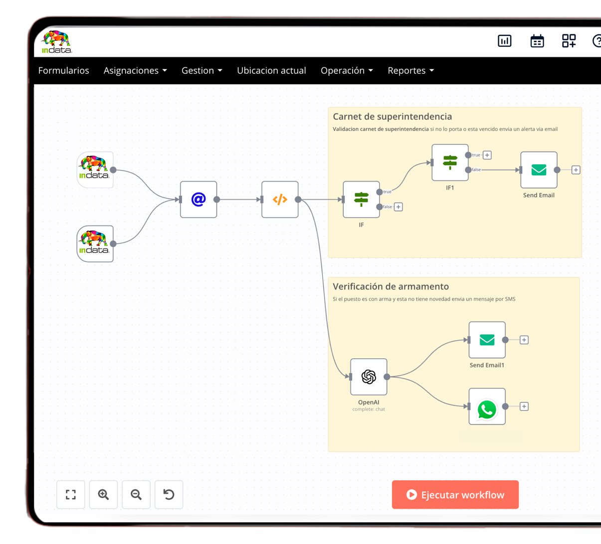 inData Workflow está integrado de forma nativa con el resto de funcionalidades de inData, permitiendole potenciar la gestión de novedades, registros, minutas, verificación de asistencia y más.