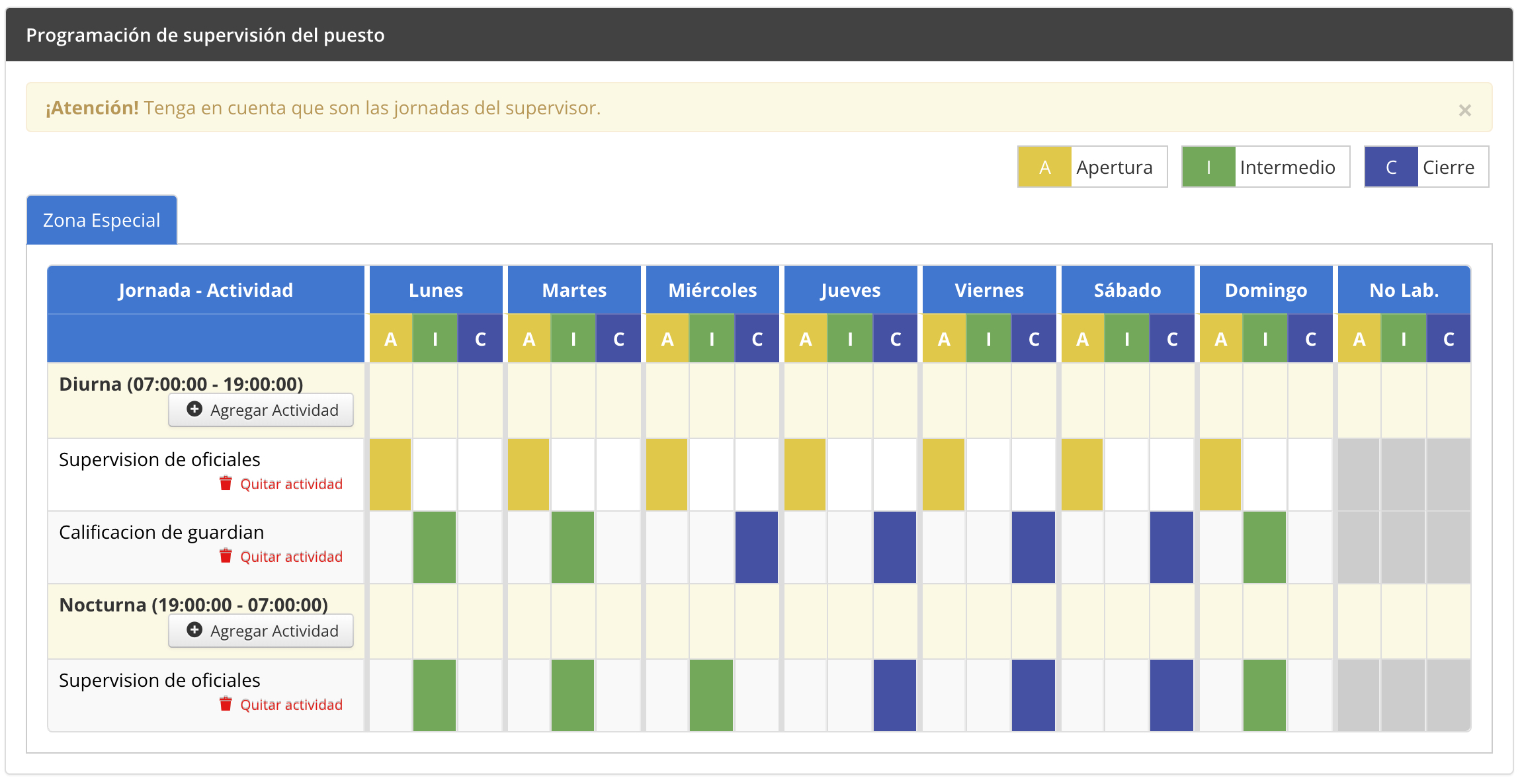 Sí, puedes crear la programación de supervisores por día, turno y zona.